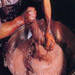 テーチ木(和名:車輪梅)をチップ状にくだいて、大きな釜で煮て、その煮汁で絹糸を染める作業です。何度も液を替え、繰り返し揉みこみ染色すると、絹糸が赤茶色に染まります。