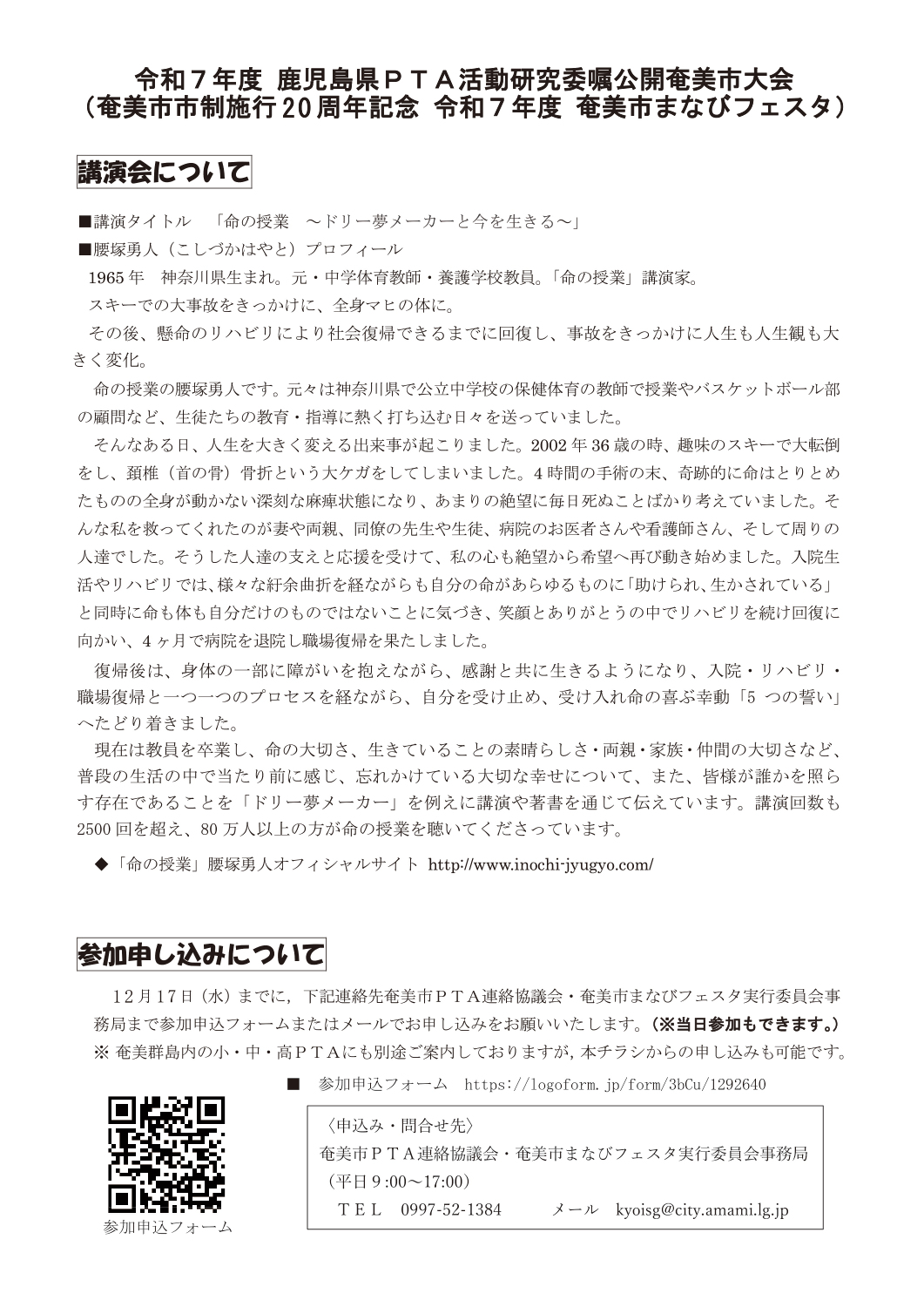 12月17日(水曜日)までに,奄美市PTA連絡協議会・奄美市まなびフェスタ実行委員会事務局まで,参加申込フォームまたはメールでお申し込みをお願いいたします。(※当日参加もできます。)